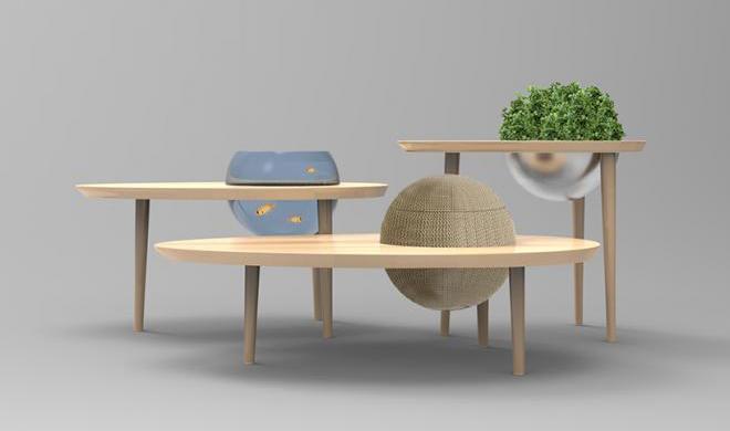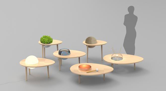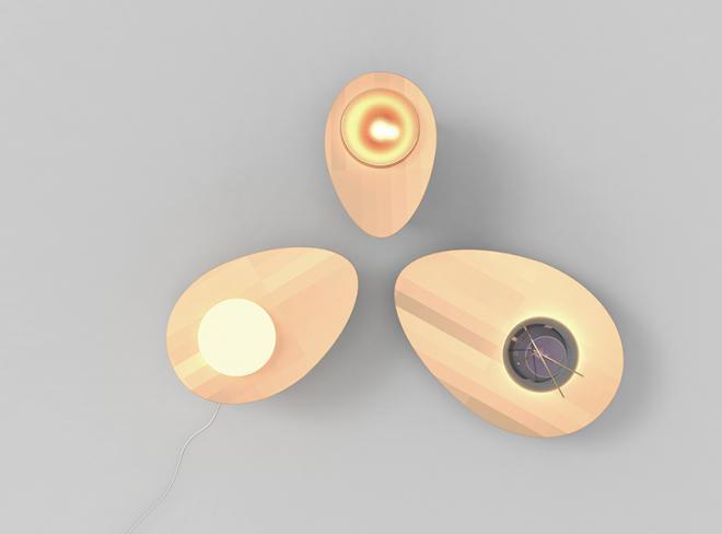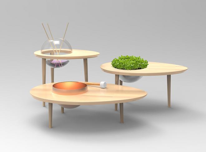 Senses are the primary way in which humans experience the world. They have existed from the very beginning, ab ovo ("from the egg"). These oak-slat, egg-shaped tables, made in three sizes (w83xd56xh65, w107xd72xh50, w130xd88xh35), serve as bases for senses. Spheres/yolks/senses entice interaction and can be moved from table to table. The spheres vary depending on the senses they provide. The metal (semi)sphere/spice planter represents taste. The deeper metal bowl with a mallet enables the creation of sounds. The almost-closed glass sphere with sticks in perfumed water spreads scents through space. The sphere with woven woollen lining is pronouncedly tactile, and it contains a storage bowl inside. The lamp sphere supports the sense of sight regardless of day or night. And the glass sphere/fishbowl represents the sixth sense - intuition, life. Thus the tables give us the possibility to enrich our lives by choosing our sensory experiences every day from the beginning, ab ovo