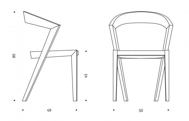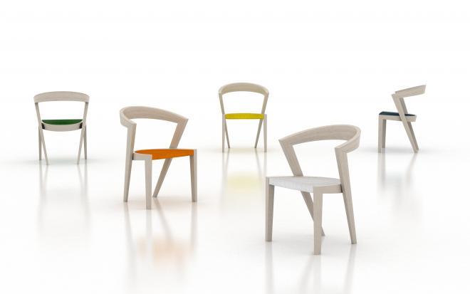 The relationship between sitting down and being seated is the main trait of this chair, as the starting point of the dynamic interplay of its two visual and functional parts which complement each other. The backrest with the hind legs and the seat frame with the fore legs are made of ashwood and treated with transparent white varnish. The seat is ergonomically profiled and upholstered with thin sponge and fabric in one of several possible colours, giving the user the possibility of individualisation. The curvature of the backrest and the subtle inclinations of the handrests and the seat frame, as well as the softness of the seat, make the chair as comfortable as an armchair even as it exudes an air of simplicity and lightness.