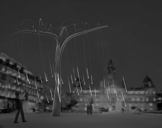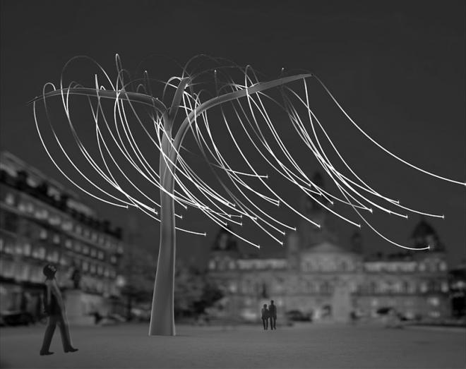 This invites human response and promotes awareness of the sustainable energy sources that surround us. In addition to that, the LED willow tree anticipates the future in which it will be possible to produce sufficient power for lighting by the movement of the lighting fixtures just as there are watch mechanisms that run on the movements of one's wrist.