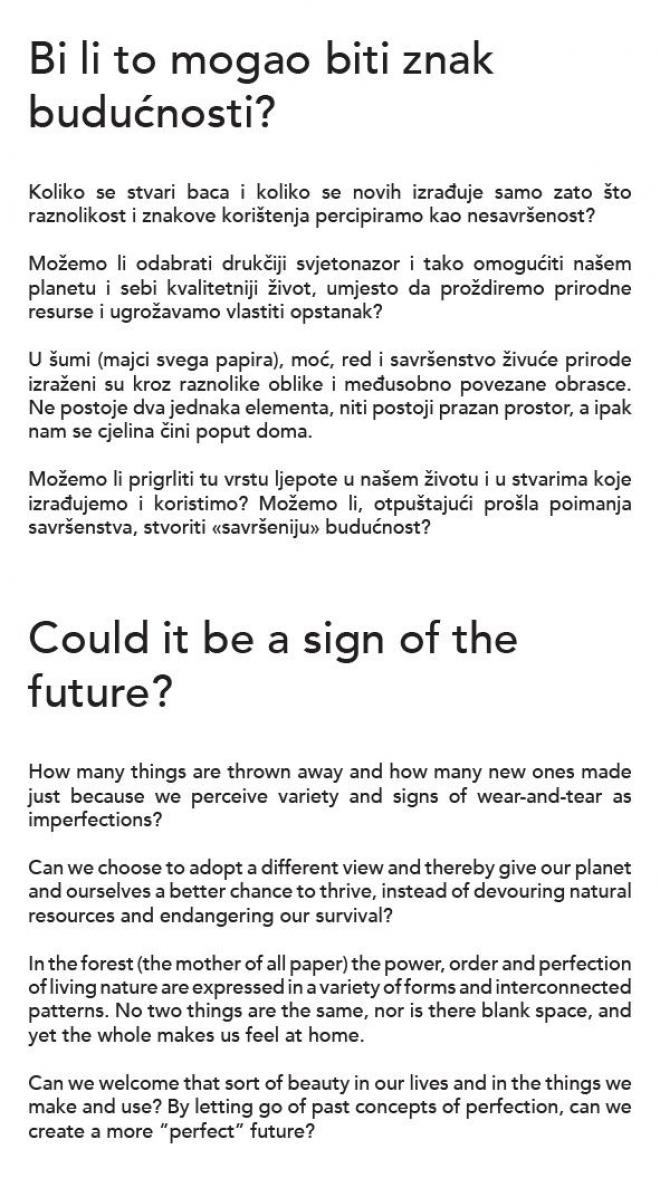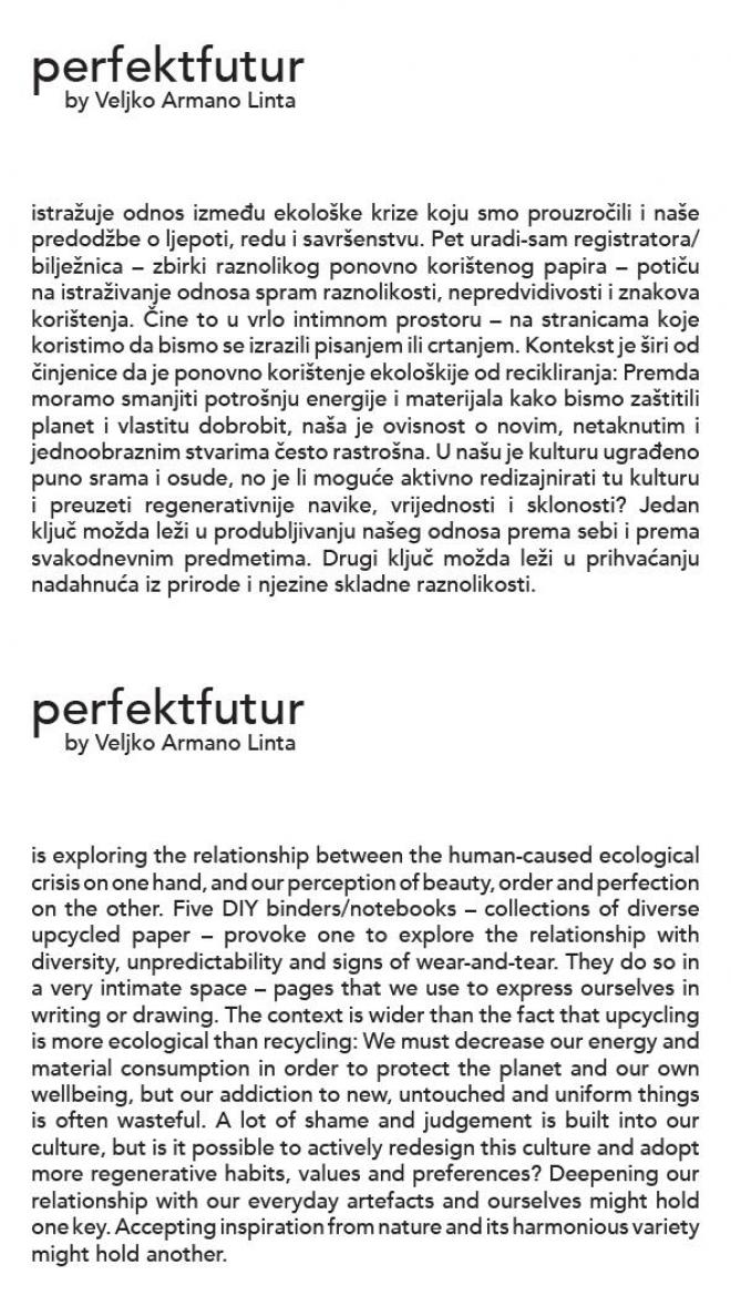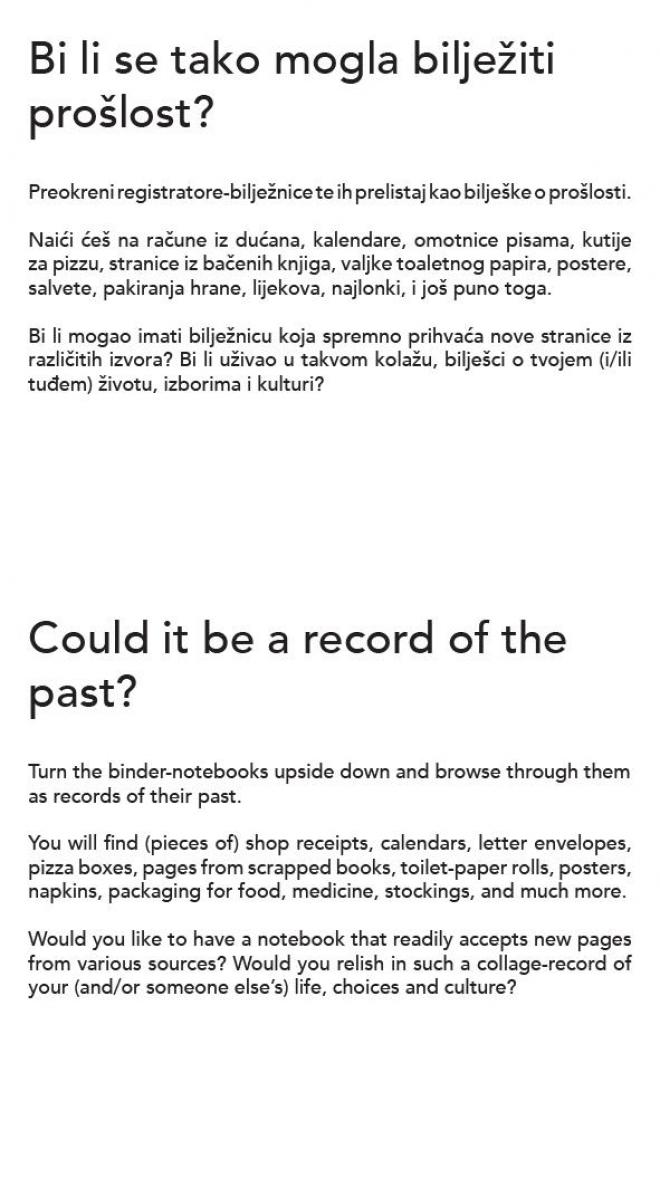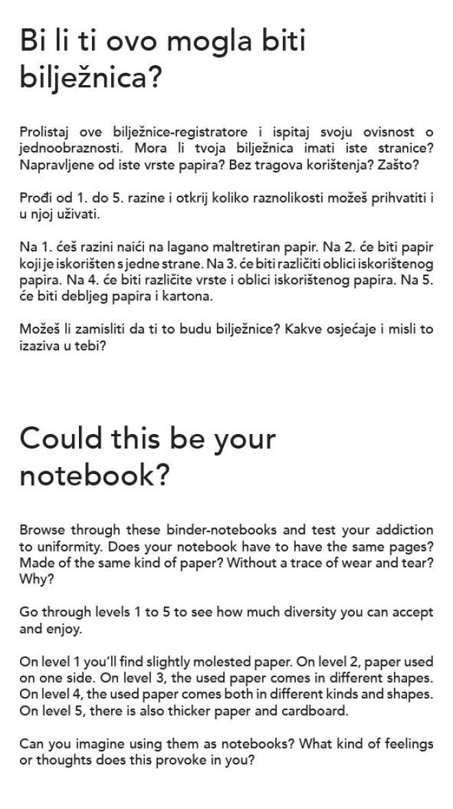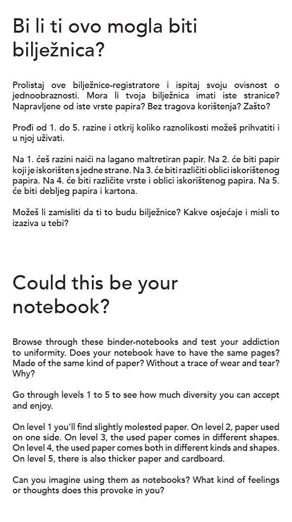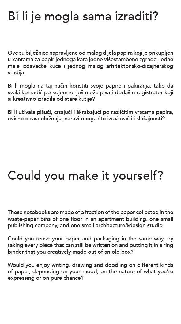 “Veljko Armano Linta has devised notebooks in which, as in ring files, it is possible to insert various pieces of already used paper – old bills, envelopes, paper napkins, bits of packaging, and on them, on the free space that is left, write new things down. This author is calling upon users to become aware and re-examine their attitude to paper and to habits and notions about desirable and attractive design.