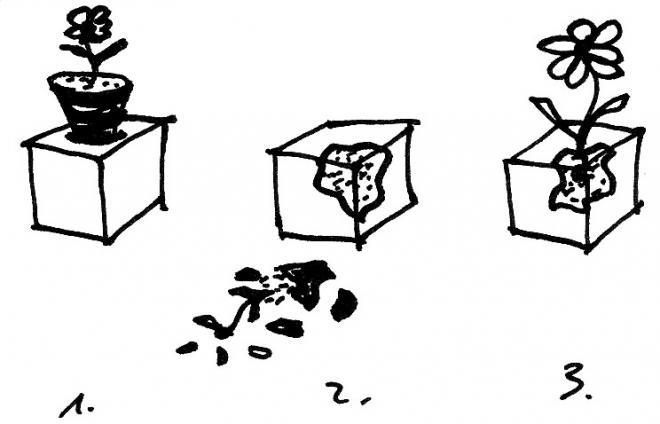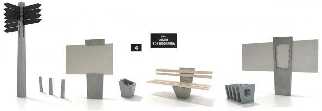 The design of the urban furniture is directly inspired by the twofold character of Tvrđa: Just like, during the course of history, war destroyed Tvrđa and the presence of army brought civic prosperity to it, the urban furniture was made from pure geometric concrete forms, that acquired their functionality by the destruction of some of their parts. Thus a whole becomes a place for fixing sitting boards, or a place for fitting a notice board, or a place for placing a litter bag, or a place through which one can pass a bike chain, or a place for fitting a guidepost sign… Just like grass can find its place in a shrapnel hole.
